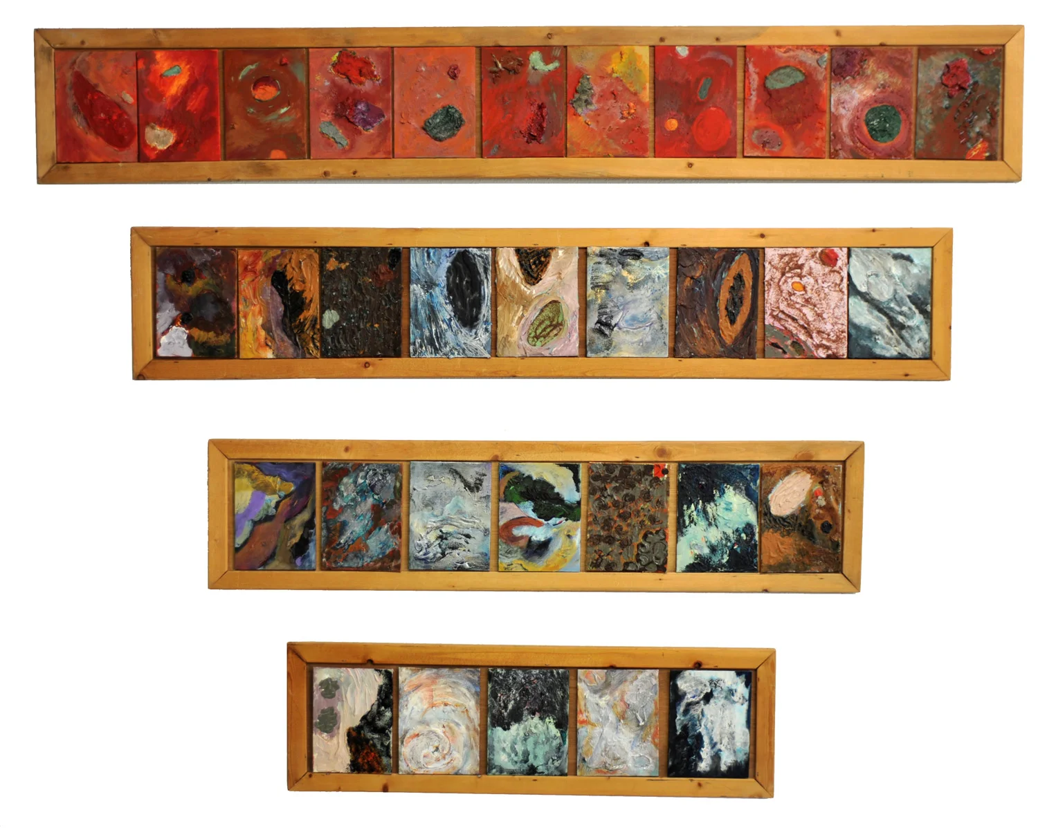 In my Tai Chi/Qi Gong practice, and as a Jin Shin Jyutsu Practitioner for the past 27 years, I work daily with Energy and Nature’s Elements: Fire, Earth, Water, Air, Wood as they exist in the Body/Mind/Spirit. Tai Chi is about how the energies keep shifting, changing, becoming. In the same way each individual painting in any row can be spotlighted or hide amongst the rest.