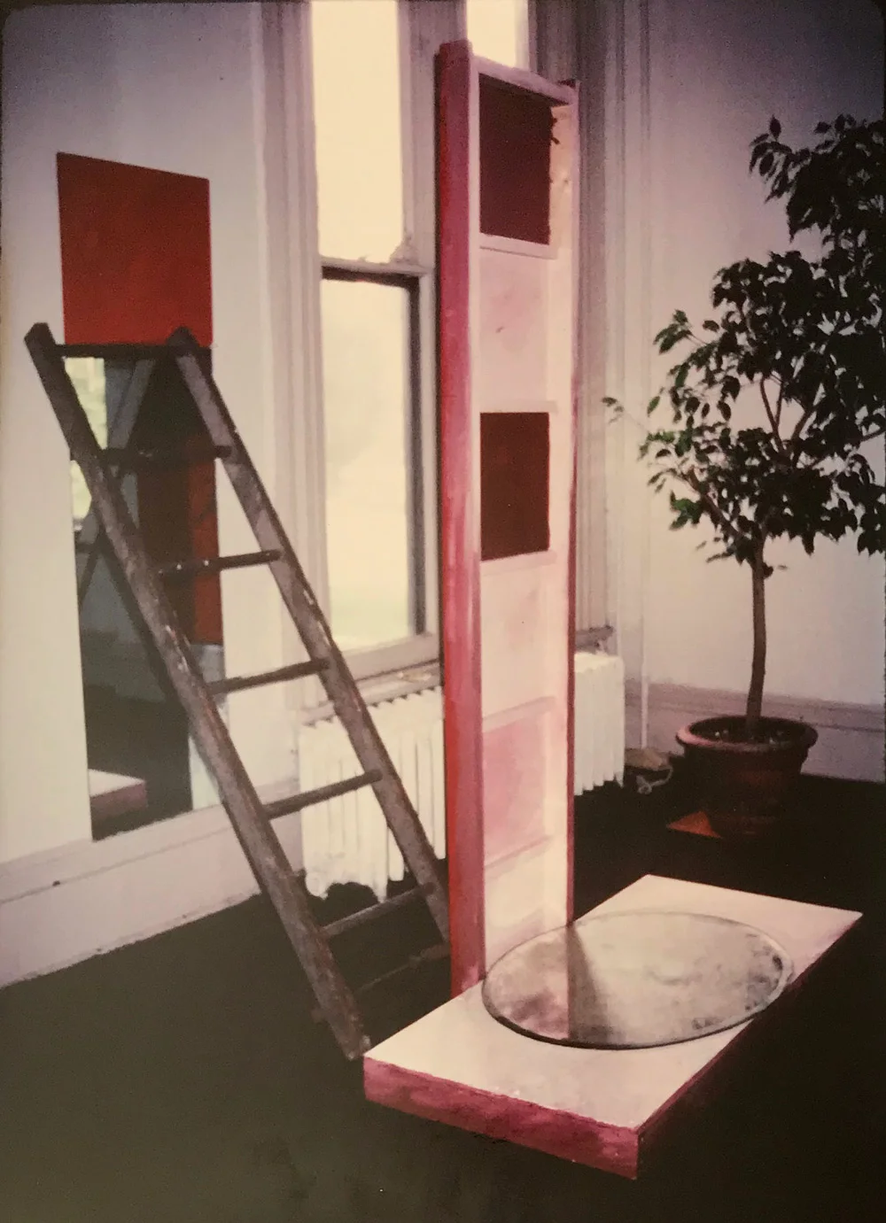 There were three rooms for the puzzling exhibit, which included ladders, bones, tree parts, a fireplace (extruding a “river of fabric” across a parquet wooden floor); a red stairway to a window surrounded by “Found Objects Self-Possessed”; and the first presentation of my interactive rearrangeable stacked paintings.