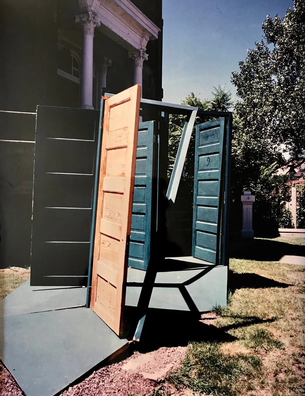 “Thresholds” was created on site to explore the idea of how we can enter the “fourth dimension” incorporating a larger reality superceding ordinary reality. There were three sets of doorways - one with screen doors; one with glass revolving doors; and one with wooden doors on a ramp. The door constructions could all be entered (See Video).